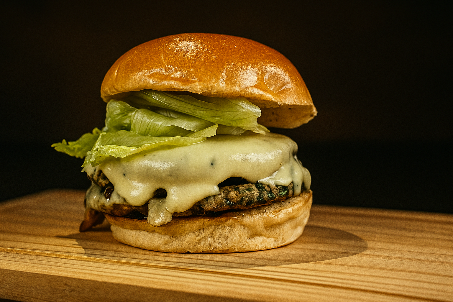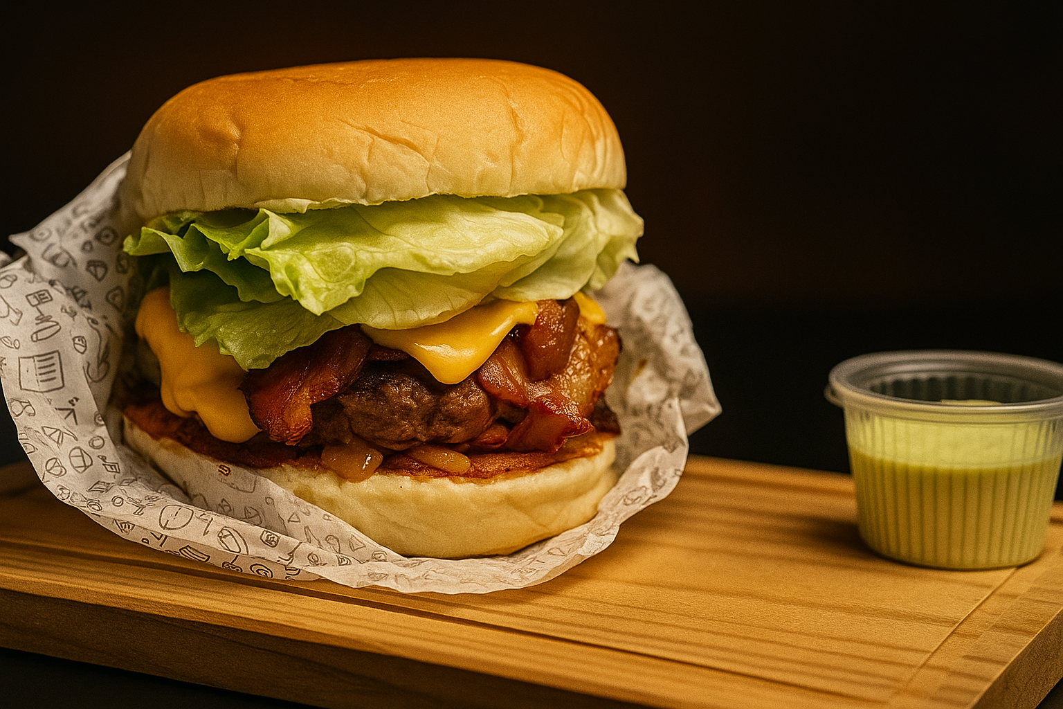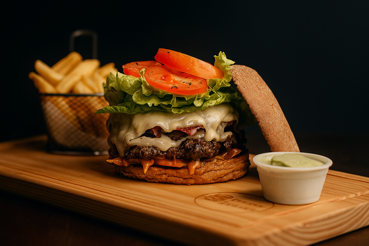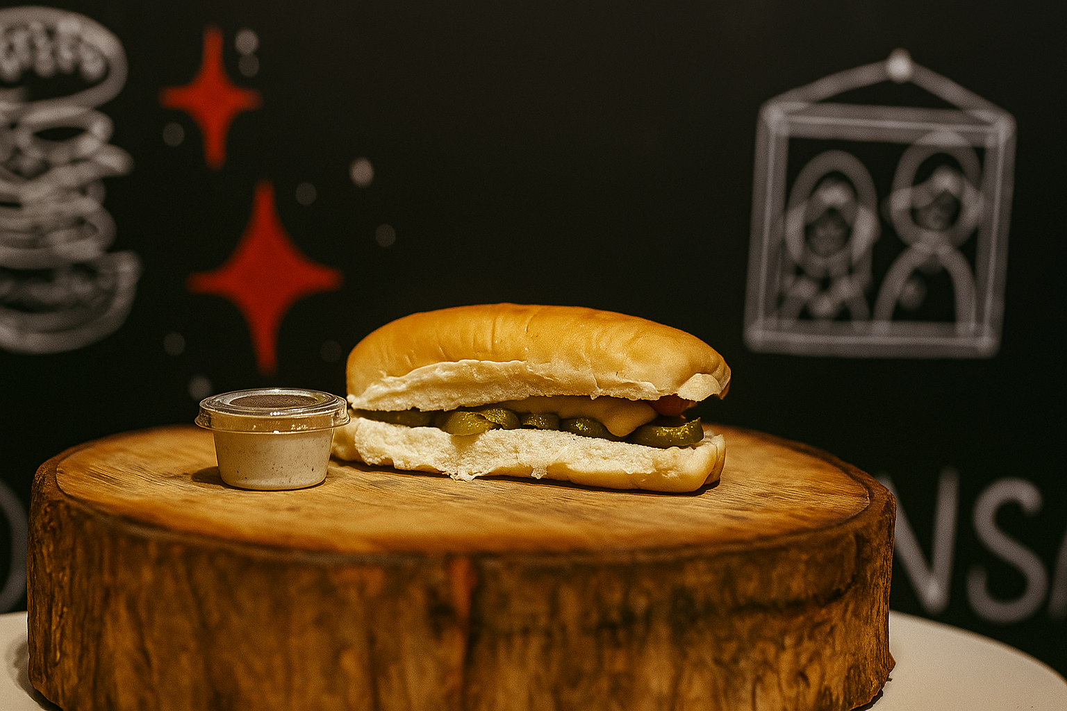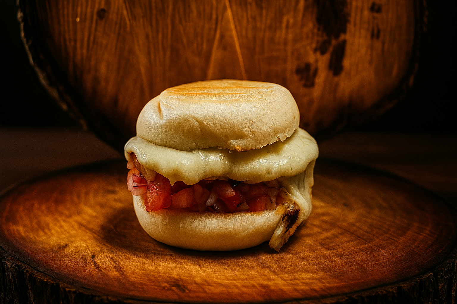 Nossa releitura artesanal de um burger de calabresa, queijo e vinagrete.